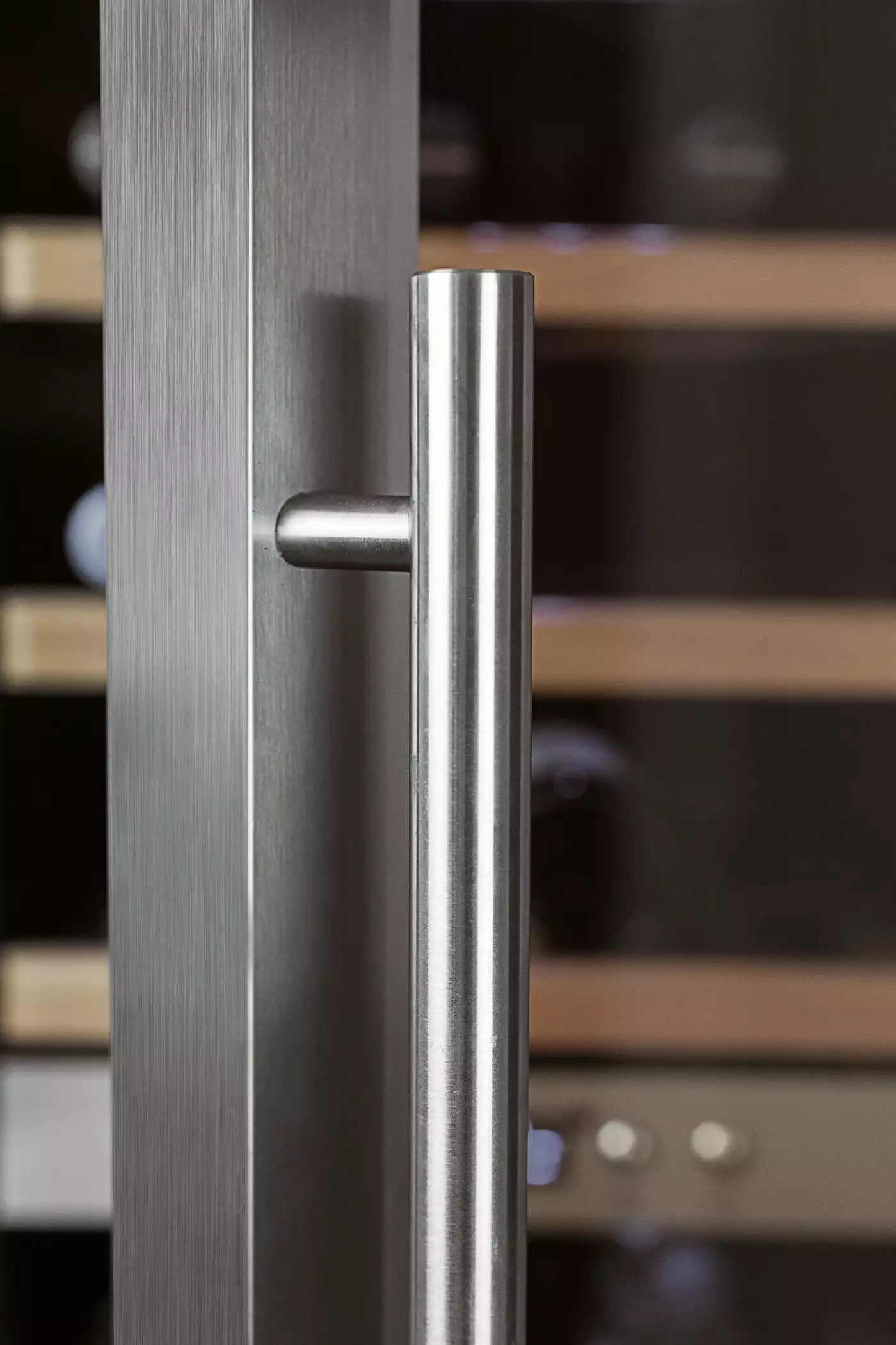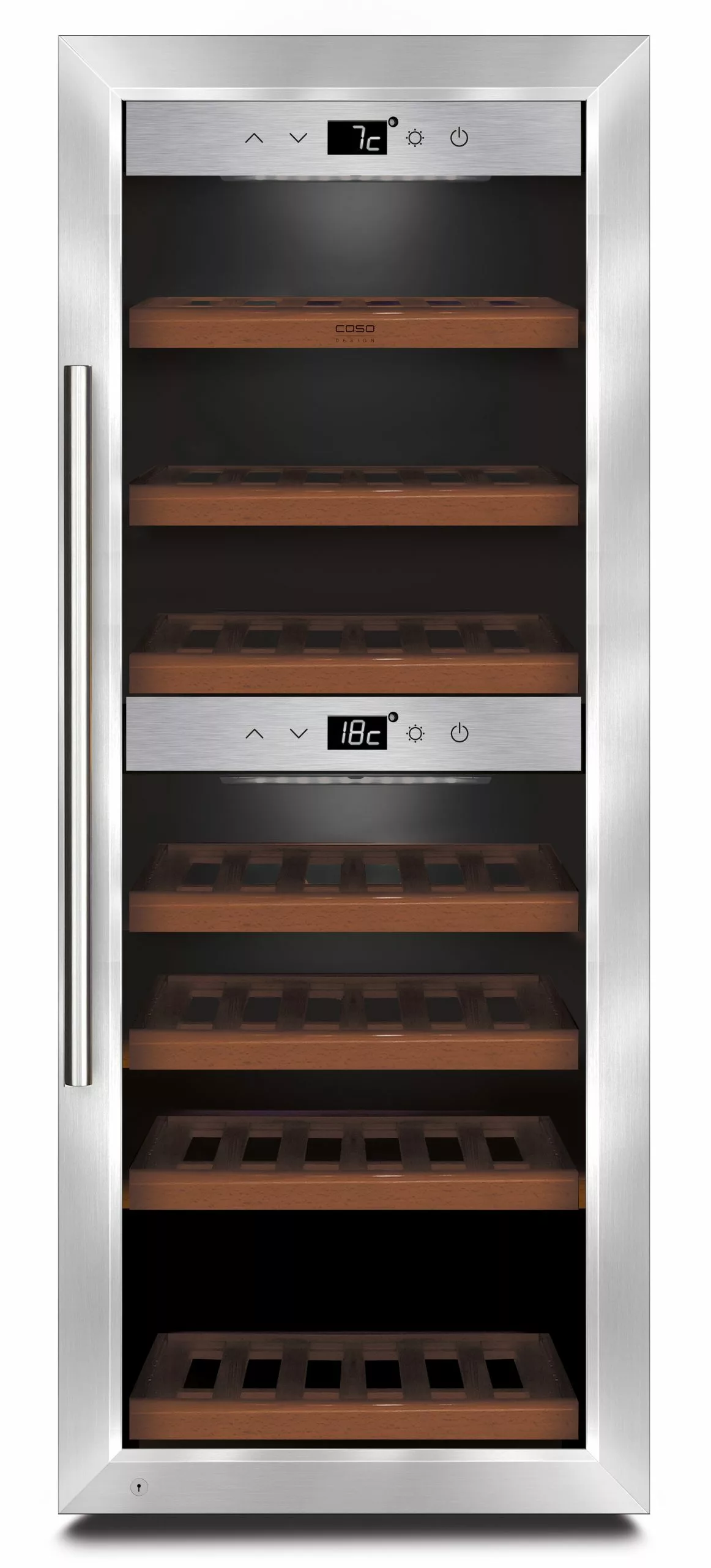 Dette Caso WineComfort er udført i rustfrit stål i både front og håndtag som med træhylder skaber en skøn kontrast og en fornemmelse af professionel kvalitet og klassisk design. Skabet køles ved hjælp af høj-kvalitets kompresser teknologi, dette giver en meget stabil temperatur i skabet, kompresserne køler til den valgte temperatur og den effektive isolering bibeholder den så vinen opbevares bedst muligt. Yderligere sikre kompressoren samt de vibrations dæmpende fødder at vinen ikke rystes under opbevaring så smagen ikke forværres. Skabet kommer med 2 temperatur zoner til rød og hvidvin, temperaturen kan styres via. WiFi med den innovative ”Caso Control App” (Download App) som både kan styre skabets temperatur, overvåge og give fejlmeldinger og virke med andre Caso produkter. Touch panelet som er placeret således at du ikke behøver åbne skabet og forstyrre temperaturen, da en stabil temperatur er vigtig for vinens opbevaring.