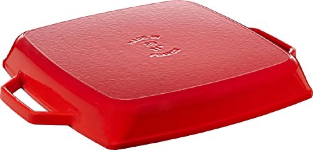 Den kvadratiske grillpande med to håndtag har en attraktiv finish. De to håndtag lader dig ubesværet flytte den fra ovnen til bordet, hvilket blot føjer en attraktiv dekoration til middagsbordet. Grillpanden kan bruges på alle varmekilder. Den har en mat, sort emalje på den indvendige side og en dyb kirsebærrød farve på den udvendige. Brug det overskydende fedt, som har samlet sig i de fine riller, til at lave en lækker sauce til dit kød. Denne kvadratiske grillpande udgør et anvendeligt køkkengrej, som tilbyder et væld af muligheder til at grille og stege kød, fisk og grøntsagsretter.