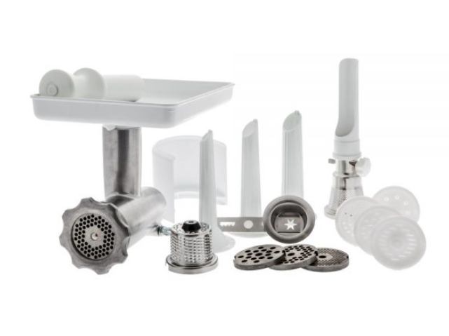 Kødhakker komplet til Assistent AKM 6230 er en pakke, hvor der medfølger kødhakker, 3 hulskiver, 4 pastaskiver og 1 Pølsehorn
