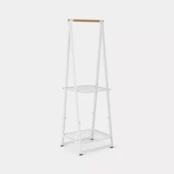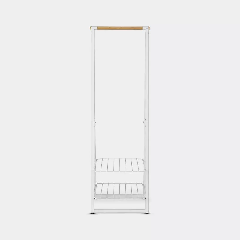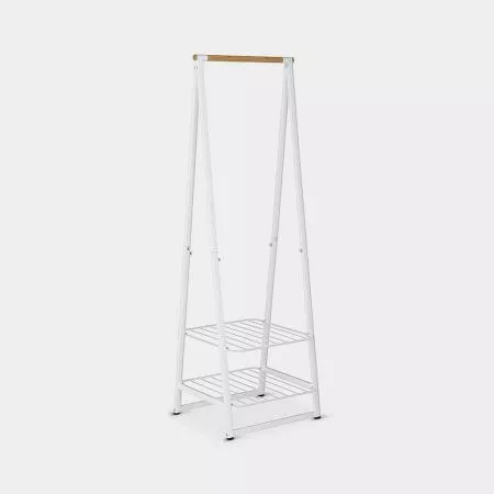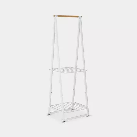 Organiser dit tøj smukt med Brabantias Linn Tøjstativ. Dette fritstående tøjstativ med robust bambusstang og to højdejusterbare hylder holder sig i ethvert hjem. Brug Linn som tørrestativ til planet-venlig tørring eller brug hende til at lufte dit tøj med stil ved at vise det på bøjler på den robuste stang. Har du brug for stilfuld opbevaringsplads? Linn hjælper gerne. Perfekt til dit soveværelse, vaskerum eller forhallen!