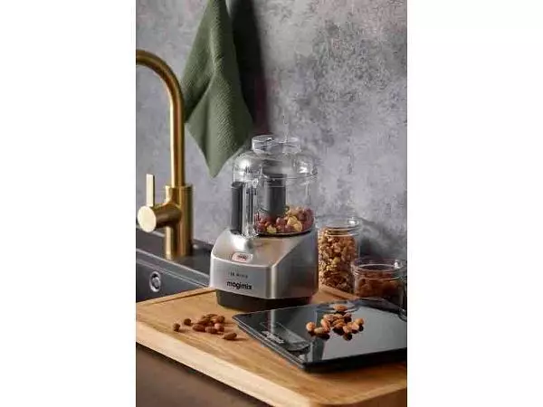 Magimix mini-foodprocessor er effektiv, stilfuld og støjsvag. Den optager kun lidt plads på køkkenbordet og har et så flot design, at du gerne lader den stå fremme. Betjeningen er enkel. Låget har to åbninger til påfyldning af henholdsvis flydende og faste ingredienser, sættes let på og tages lige så nemt af. På fronten findes en enkelt knap til at aktivere både pulse-funktion og kontinuerlig kørsel.