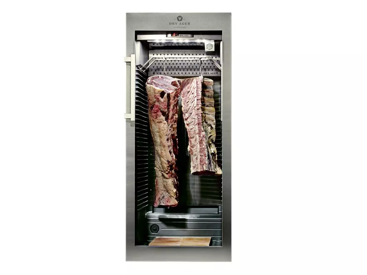 Rustri kabinet med vendbar glasdør og rustfri ramme.