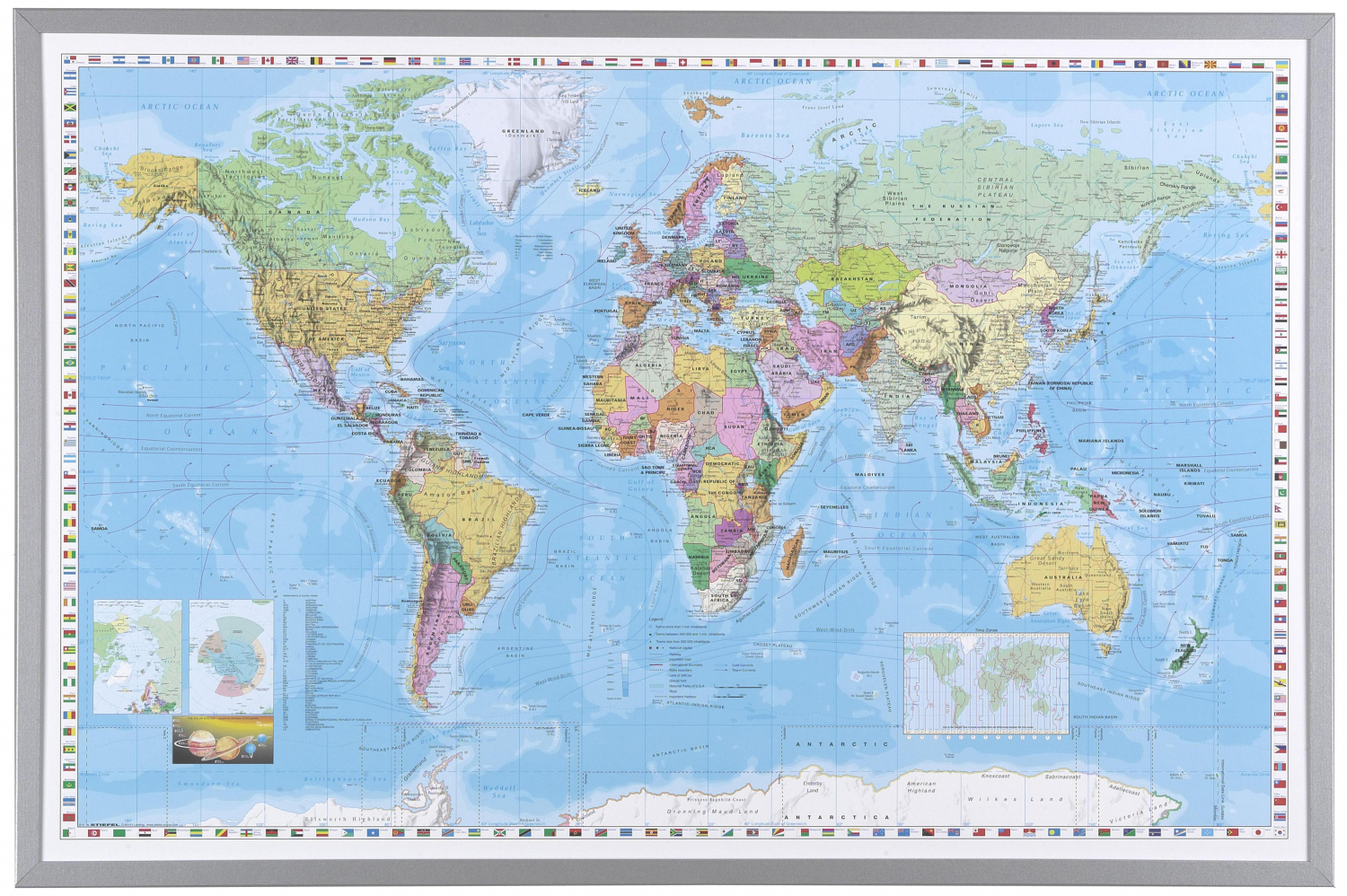 Indrammet Verdens kort 60 x 90 cm. Med sølvfarvet MDF ramme. Dette kort kan bruges med pins. Incl. 6 flag pins.
