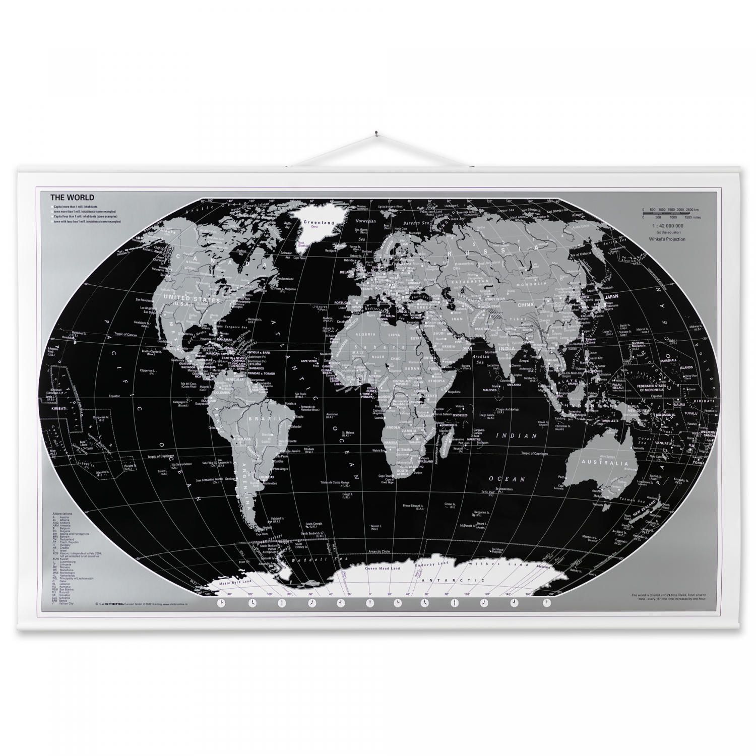 Rullet Sort/Sølv Verdens kort 97 x 67 cm. Lamineret, med skriv/visk ud funktion. Ridsefast overflade. Metalskinner og ophængssnor. Leveres i et plastik rør.
