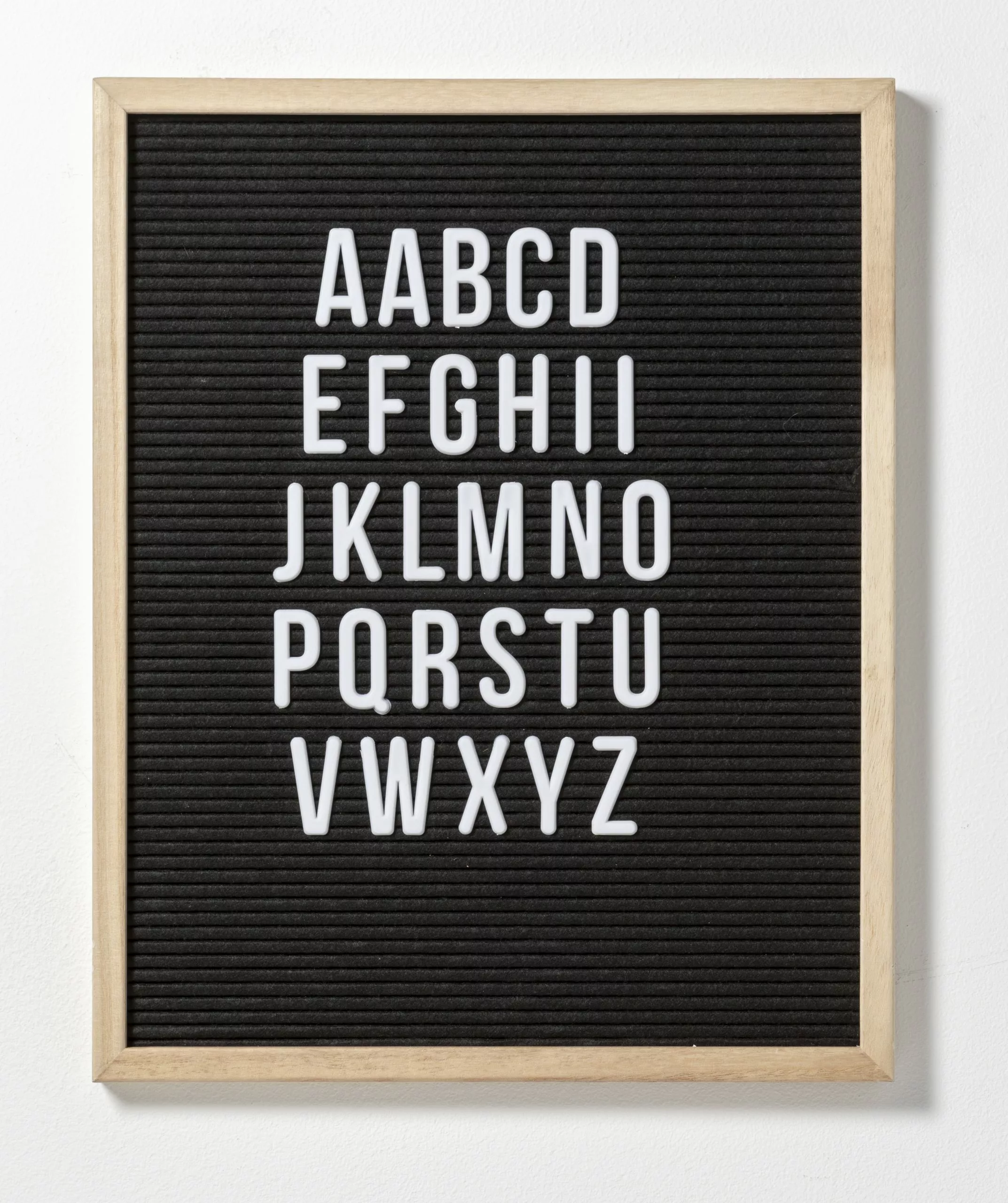 28 udskiftelige, 5 cm. høje, hvide bogstaver til Bogstavle i sort filt.