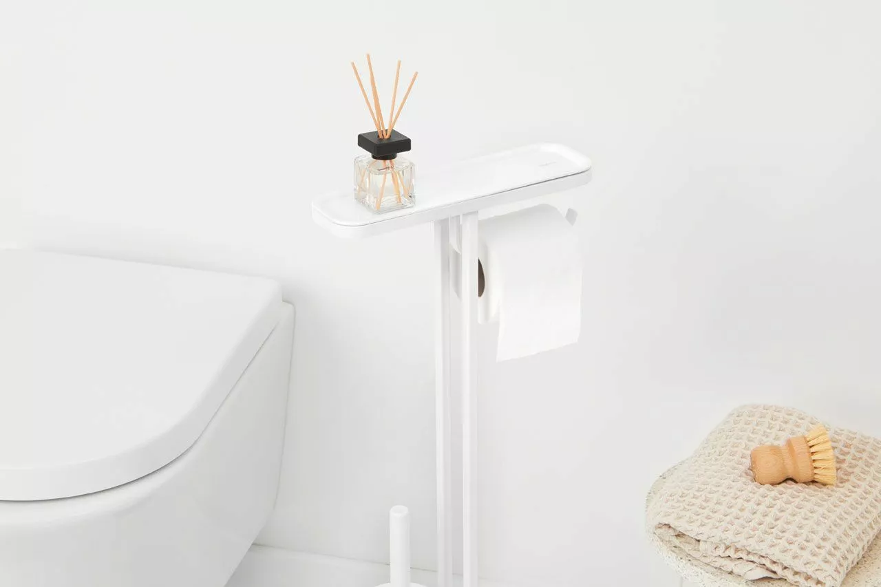 Alt-i-én – hylde, toiletrulleholder og toiletbørste i ét stativ.