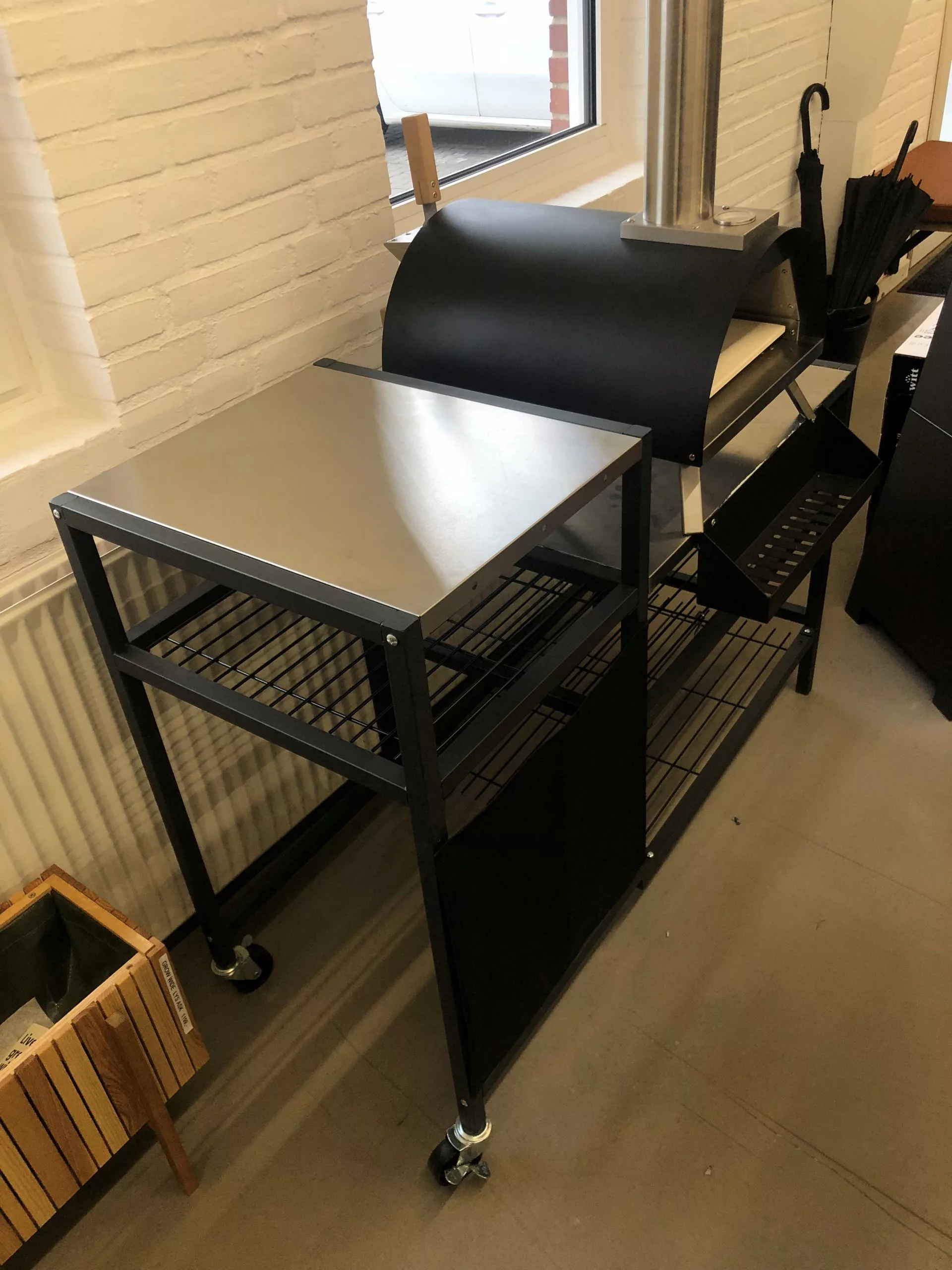 Smart udendørs Udekøkken med hylder som nemt kan anvendes på terrassen eller andet. Udekøkkenet har hjul så det nemt kan transporteres rundt og har plads til fx pizzaovn. Bordet er er bygget af holdbart stål med håndtag og har god opbevaring.