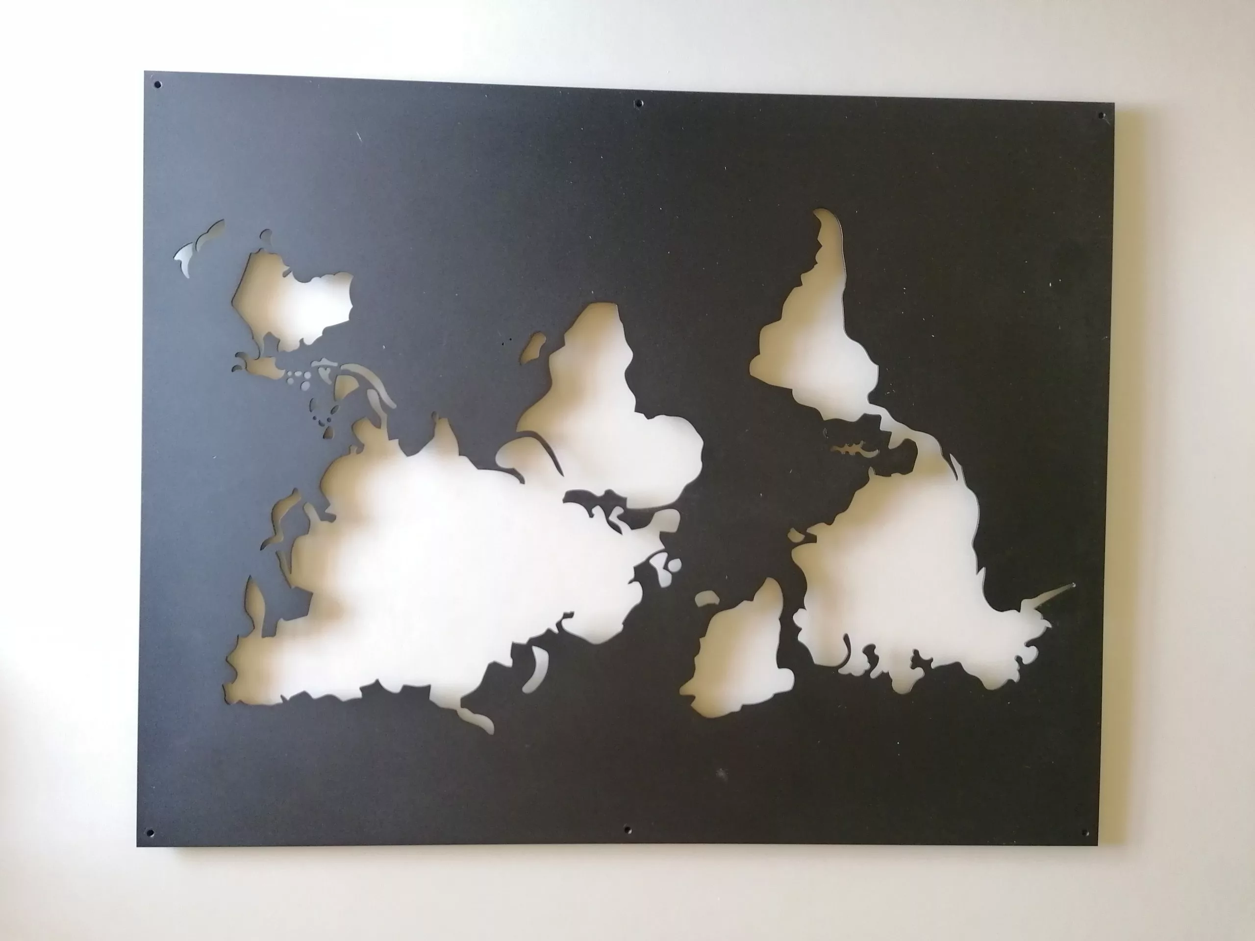 Dette verdenskort er lavet i stål og er sort pulverlarkeret.